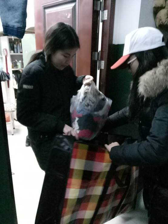 志愿者们在嘉惠园和大活附近通过摆点宣传本次活动,鼓励更多的同学们参与其中,活动负责人也积极地与武汉市小动物保护协会进行接洽。此次活动于12月9日晚7点正式开展,志愿者们在普宿7,8,9,10栋扫楼,搜集旧衣物,并对旧衣物进行筛选,尽量选择适合冬天的衣物。同学们也都早早将衣物打包好,等待着志愿者上门收取。来自九栋的一名同学李晨雨在捐赠完衣物后,说道:“这真的是一次很有意义的活动,可以尽自己的一份力去帮助那些小动物,我感到很开心!” 整理打包好的衣物由活动负责人带领部分志愿者于12月17日上午送到武汉市小动物保护协会。