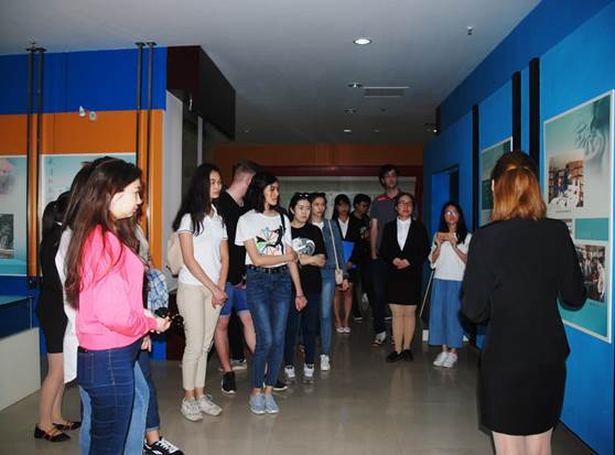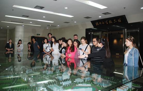 成立仪式结束后,紧接着开展了校史外语宣讲的第一次活动。总负责人鲁欣然带领四个志愿者讲解员和国际留学生一起参观校史馆。首先由16级英语专业的夏岚担任讲解员向留学生展示学校模型,并做相关讲解。留学生纷纷拿出手机拍照,指着各栋楼房模型向讲解员提出疑惑,寻求解答,氛围热闹活跃。随后夏岚又依次向留学生介绍了校训、校徽、校歌以及几位为学校建设做了巨大贡献的前辈—李先念、黄建中、张伯瑾、李四光、汪奠基,和学校的历史沿革;紧接着讲解员带领留学生参观了留学生楼、文史楼和八十年代计算机的模型,并作了相关讲解。最后由16级翻译专业的杨华丽讲解员向留学生们介绍本校与美国孟菲斯大学、与巴西圣保罗州立大学合办的孔子国际学院以及五人制室内足球,并向他们展示了一些与国外合作期间与留学生的合照,引起了留学生极大的兴趣。