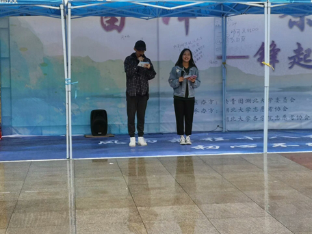 据悉,项目展示区是最具外院特色的活动区域。区域内展示了外院志协三大特色项目:“松柏青常在”、“英乐之声”和“外语宣讲队”。主讲人黄悦为参与者们详细讲解了外院志协在福利院、敬老院以及校史宣讲中的具体志愿行动,活动现场大家跟着工作人员学做手指操,参与者们制作的串珠手链将作为日后送给福利院小朋友们的礼物。午后,来自外院的郑旭元和吴诗语带来了一首暖场歌曲:《A million dream》。值得一提的是,华中师范、中南财大、武科大等外校的同学也参与到活动中。