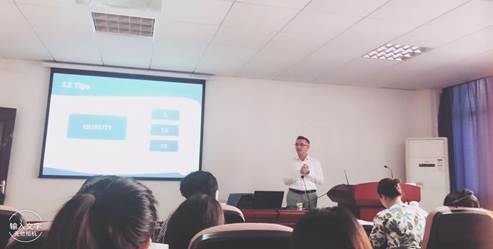 首先,他紧扣主题,明确阐述了何为教师研究和专业人员学习。其次,提出了有效的教师专业人员发展的特征:时间上的延伸度,行动上的积极和合作,思想上的反思,空间上的定位和由教师主导驱动。同时列举了九个研究活动供教师参考,在其中着重讲解了教师研究,教师研究是什么以及有何意义。在此,他区分了学术和专业人员研究目的的不同,为教师研究指明了明确的方向,教师研究是为了成为更好的教师而非研究者,这一点值得我们深思。第三,他用冰淇淋作为类比,用生动通俗的例子告诉我们教师研究的四种不同的切入点并归纳总结了研究的过程,即提问-行动-评估-学习-应用-提问的无线循环,期间研究者需要不断阅读,反思,与他人合作和交流。他通过案例分析Andy’s project向我们讲述了整个研究过程。第四,他提到了数据收集的12种方法,并用生动的卡通图片、做鬼脸图等方式给予我们启示:研究也可以是具有创造力且有趣的过程。第五,教师研究的诸多好处:教师更有自信心、上课动机更强、更具有批判性思维、理解体谅他人、更具有自主性,有新的想法更愿意去运用到课堂中。第六,完成一个小任务,将进行教师研究的18条建议挑选出12个分4组进行归类。最终教授向我们展示了他的分类:质量、可行性、相关性和合作。毫无疑问,他的这四种分类标准对我们的研究具有现实指导意义。最后,他向我们推荐了与教师研究相关的四本英文期刊,期望我们为该领域的发展做出自己的贡献,踊跃投稿。该讲座受到了外院师生的一致好评,我们都认为Simon Borg教授不仅学识渊博,而且风度翩翩、风趣幽默,其讲座主题紧密贴合我们的实际需要。