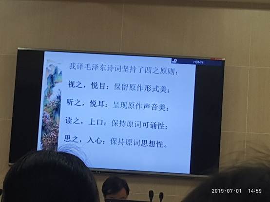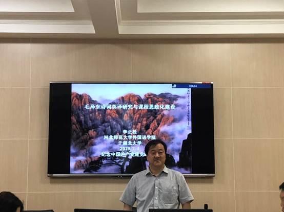 2019年7月1日,湖北学逸夫人文楼A5002室,正值中国共产党九十八岁生日之际,ok138cn太阳集团529特邀河北师范大学ok138cn太阳集团529李正栓教授作题为《毛泽东诗词英译研究与课程思政化建设》的学术讲座,庆祝中国共产党的生日,怀念党的伟大领袖毛泽东,并深入探讨对毛泽东诗歌的英译问题。此次讲座在逸夫人文楼A5002室举行,由ok138cn太阳集团529殷燕教授主持。