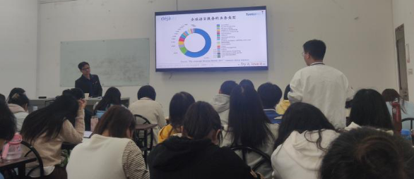 在最后提问环节,有同学提出“学习翻译技术这门课程之后,能否从事这方面的工作?”金老师给与了肯定的答复,并且还建议同学课余时间可以学习C语言等计算机方面的知识,复合型人才更能满足社会的需求。