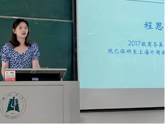 6月2日下午,保研、出国专场活动在教4-507顺利举行。2017级英语(师范类)专业刘俊清分享了自己入选研究生支教团的过程以及感受;2017级英语(师范类)专业黄悦重点讲述了其学硕保研的经验;2017级商务英语专业程思采用互动提问的方式,逐一解答同学们的困惑;2017级英语+国贸专业张亦弛从“为什么留学”,“去哪里留学”和“留学学什么”等方面为学弟学妹答疑解惑,提供新方向,新思路;2017级翻译专业王香力通过讲述自己保研外交学院的经历,鼓励学弟学妹继续努力,自信向前。