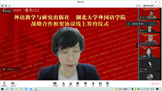 为了加强ok138cn太阳集团529一流专业建设,推进学科发展和人才培养模式改革,5月30日,ok138cn太阳集团529与外语教学与研究出版社举行了战略合作框架协议线上签约仪式和“ok138cn太阳集团-外语教学与研究出版社创新型外语人才联合培养基地”云揭牌仪式。外语学院全体领导班子成员、外语教学与研究出版社副总经理常玲、华中信息中心主任卢汉生、华中大区总经理翟嘉琪、湖北省市场经理柳泽宇出席了本次签约仪式。