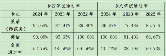 近三年,在全国英语专业四级和八级考试中,本专业学生取得了较好的成绩,一次性通过率均超出其他同类院校多个百分点。