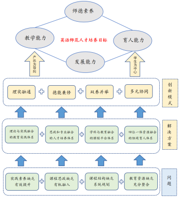 英语(师范类)从“师德素养、教学能力、育人能力、发展能力 ”四个方面凝练出复合型英语教师的培养目标;以此为基础,构建了“德能兼修、双养并举、理实融通、多元协同”的英语师范类人才培养模式。