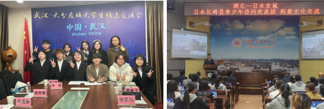 日语专业积极开展对外交流活动,与日本千叶大学、新潟大学、长崎县立大学等多所日本大学建立了长期合作关系,开展学生“交换留学”项目,每年派出三年级学生赴日留学一年。此外还有赴日短期访问项目和研习项目供学生选择。日语专业学生频繁参与中日两国政府和民间组织的各类交流活动,如多次接待日本长崎大学生代表团访问,接待日本创价大学代表团访问,连续多年参加大分-武汉友城大学生线上交流会等。国际交流活动开拓了学生的视野、提升了学生的综合能力,同时也扩大了日语专业的影响,提高了学校的声誉。